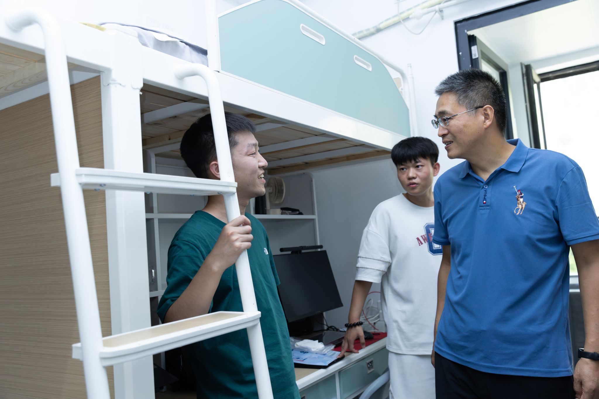 家长见面会后,学院领导与辅导员、班主任组成慰问小组,逐一走访了新生宿舍,为初入校园的同学们送上关怀与指引。走进宿舍,老师们首先亲切地与同学们及陪同家长打招呼,仔细查看了宿舍的床铺整理、物品摆放情况,询问大家是否顺利完成入住、生活必需品是否齐全、对住宿环境是否适应。在与新生的交谈中,老师们耐心倾听大家的到校感受,鼓励同学们尽快调整状态,快速融入集体生活,并主动分享了适应大学学习节奏、参与校园活动的经验建议。