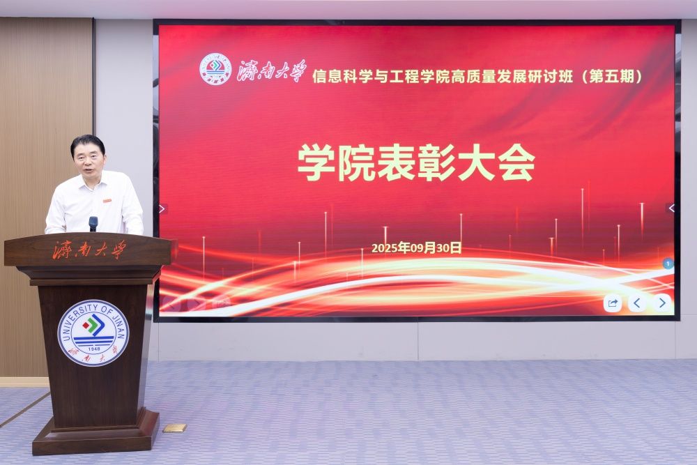 全体教职工的努力和取得的优异成绩表示肯定,向本次获得表彰的老师们表示热烈祝贺,并结合学校“顶天立地、特色发展”的办学定位,就学院下一步工作提出三点希望和要求:一是以“博士点建设”为核心,围绕人工智能、网络安全、智能装备等优势方向,搭建跨学科研究平台,推动学科实力再升级;二是以“师资梯队”为关键,构建“老中青”衔接有序、结构合理的师资梯队,强化师德师风建设,深化“科研反哺教学”,打造教育教学硬实力;三是以“产教融合”为抓手,紧密对接济南市产业优势,与浪潮集团、中国重汽等龙头企业深化合作、共建平台,建立成果转化常态化推进机制,提升服务地方区域发展贡献度。