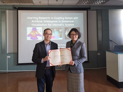 客座教授聘任证书。报告中,陈博士介绍了其团队在可视化和人工智能领域取得的最新研究成果,其中包括基于视觉科学设计可视化方面、视觉可视化在实现人类智能和机器智能结合方面以及机器智能在读可视化图形时的行为和偏见等方面的最新发现。陈博士语言生动有趣,深入浅出、内容丰富,让广大师生收益匪浅。