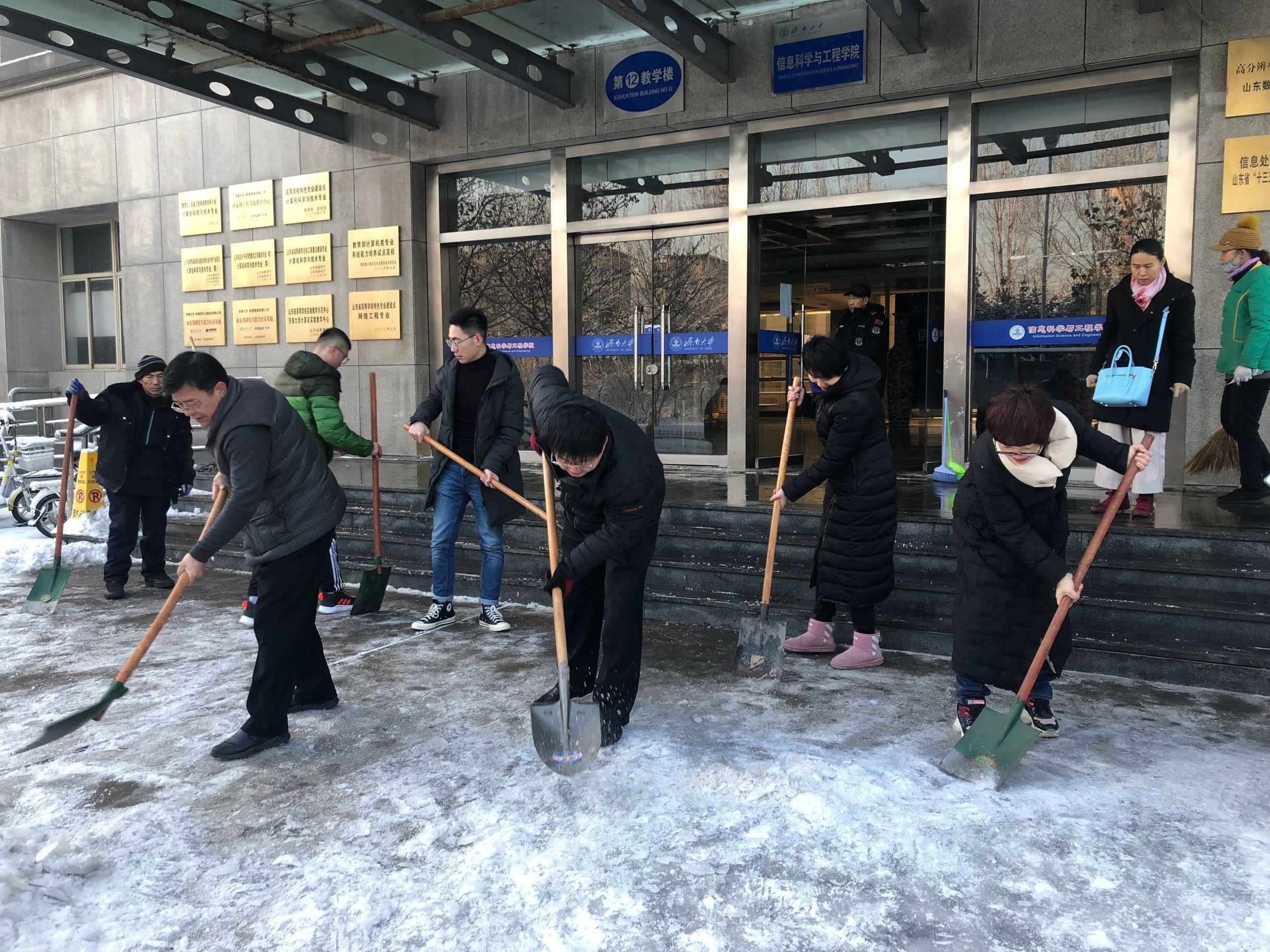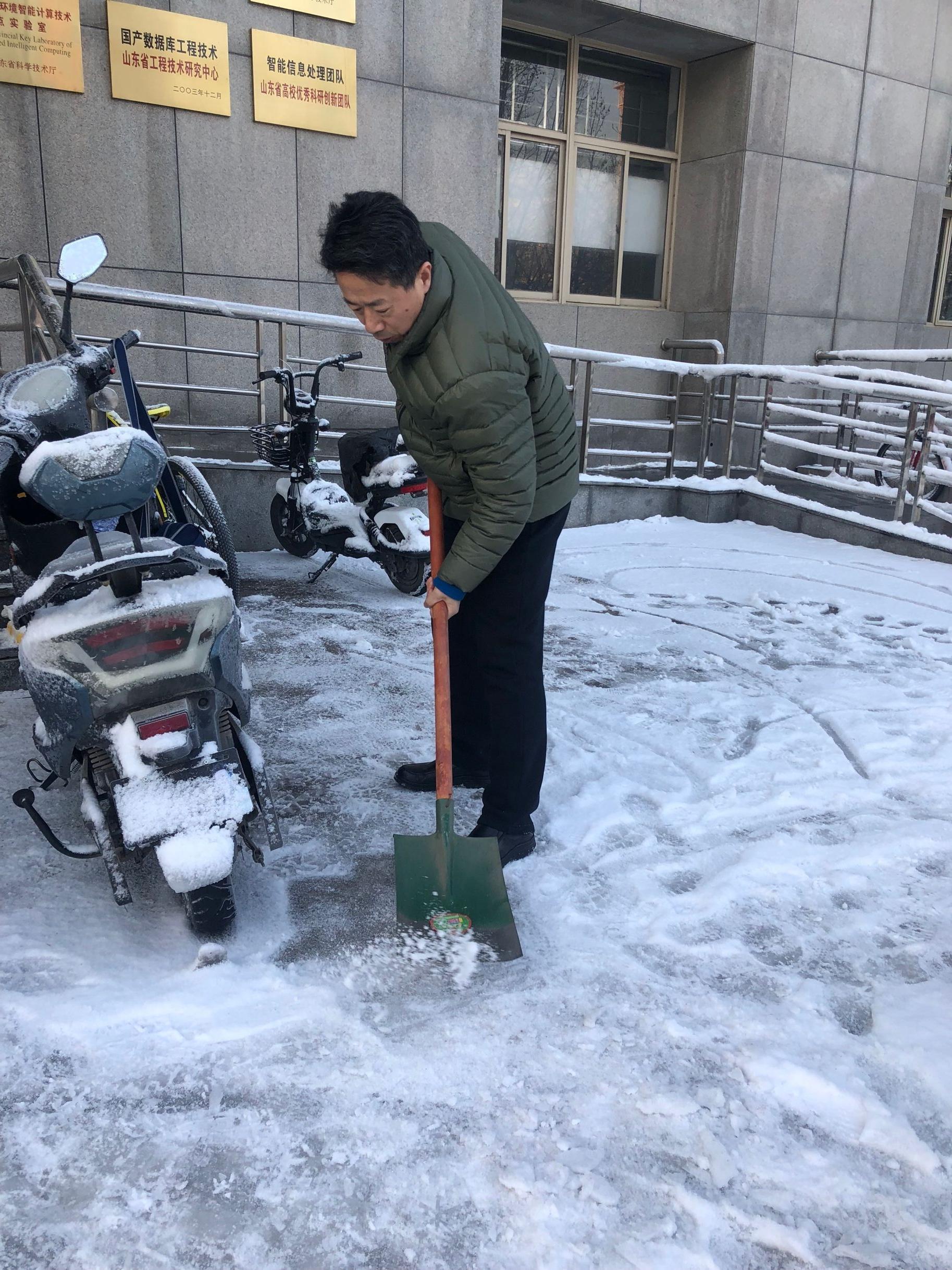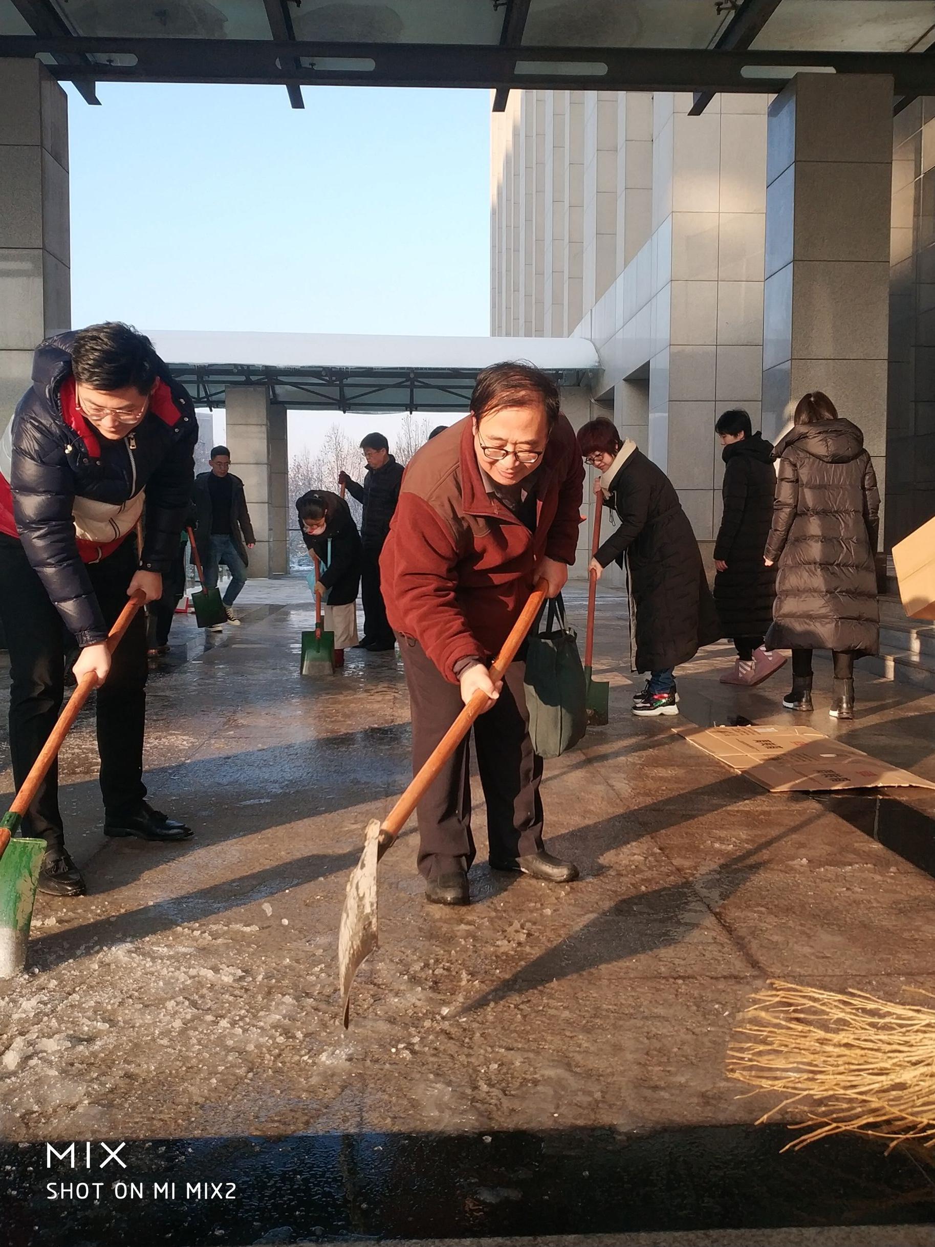 领导班子带领学院部分教职工以及学生志愿者积极行动起来,开展扫雪除冰活动,清除学院主干道和周围积雪,方便师生出行。大家手拿铁锨、扫帚等工具,从教学楼前开始,依次沿楼前东西通道、教学楼北侧逐一清理积雪。扫雪现场,老师们齐心协力,配合默契,干得热火朝天。虽然室外温度很低,但大家劳动的热情和团结协作的力量让这个冬日变得格外温暖。经过大家的努力,学院周围道路上的积雪基本清扫干净,为全院师生开辟了一条洋溢着暖暖温情的方便之路,保证了全院师生的出行安全,也呈现出来自学院的温暖和人文关怀。