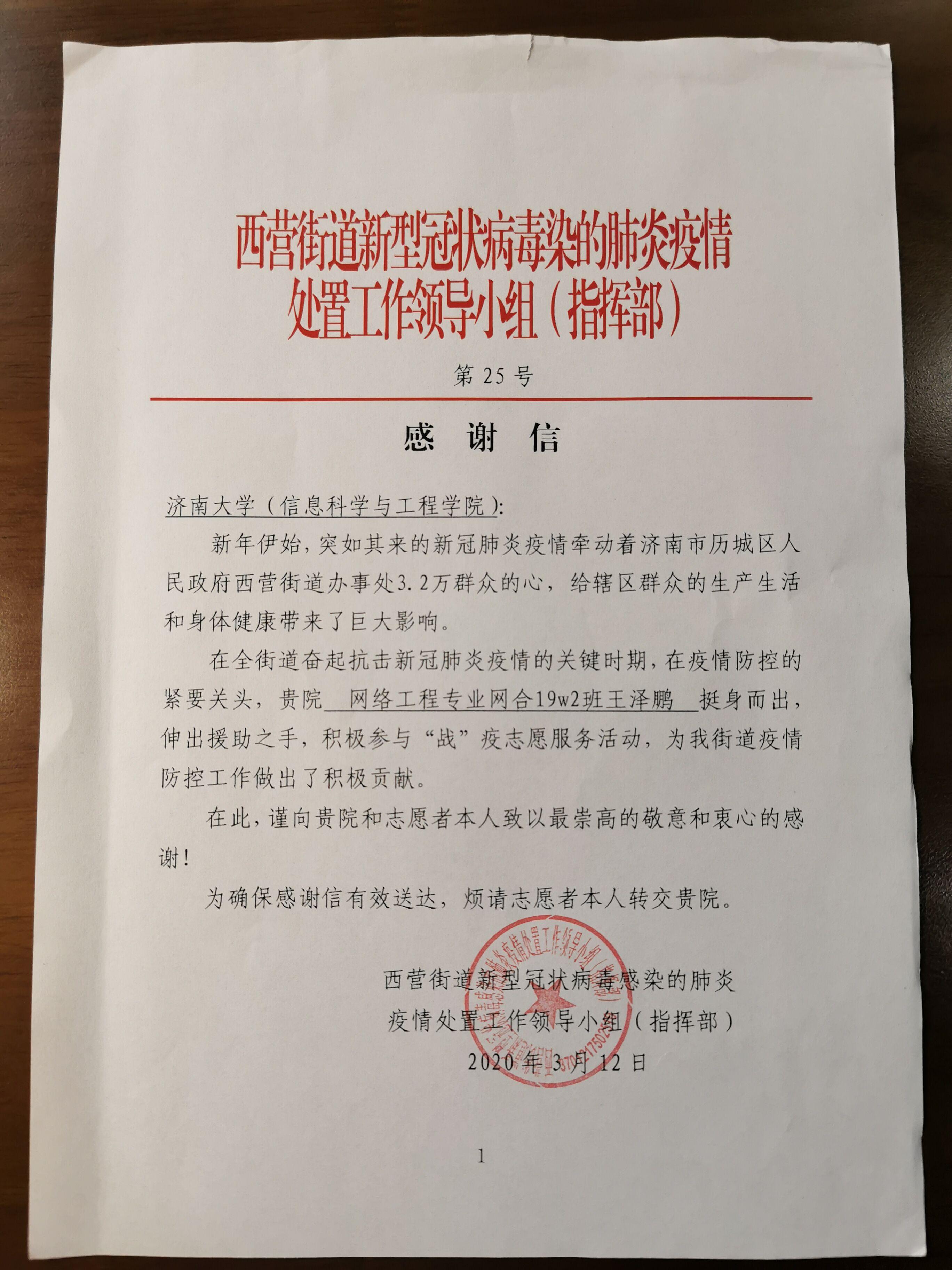 信中写道——在全街道奋起抗击新冠肺炎疫情的关键时期,在疫情防控的紧要关头,贵院网络工程专业网合19W2班的王泽鹏挺身而出,伸出援助之手,积极参与战“疫”志愿服务活动,为我街道疫情防控工作做出了积极贡献!