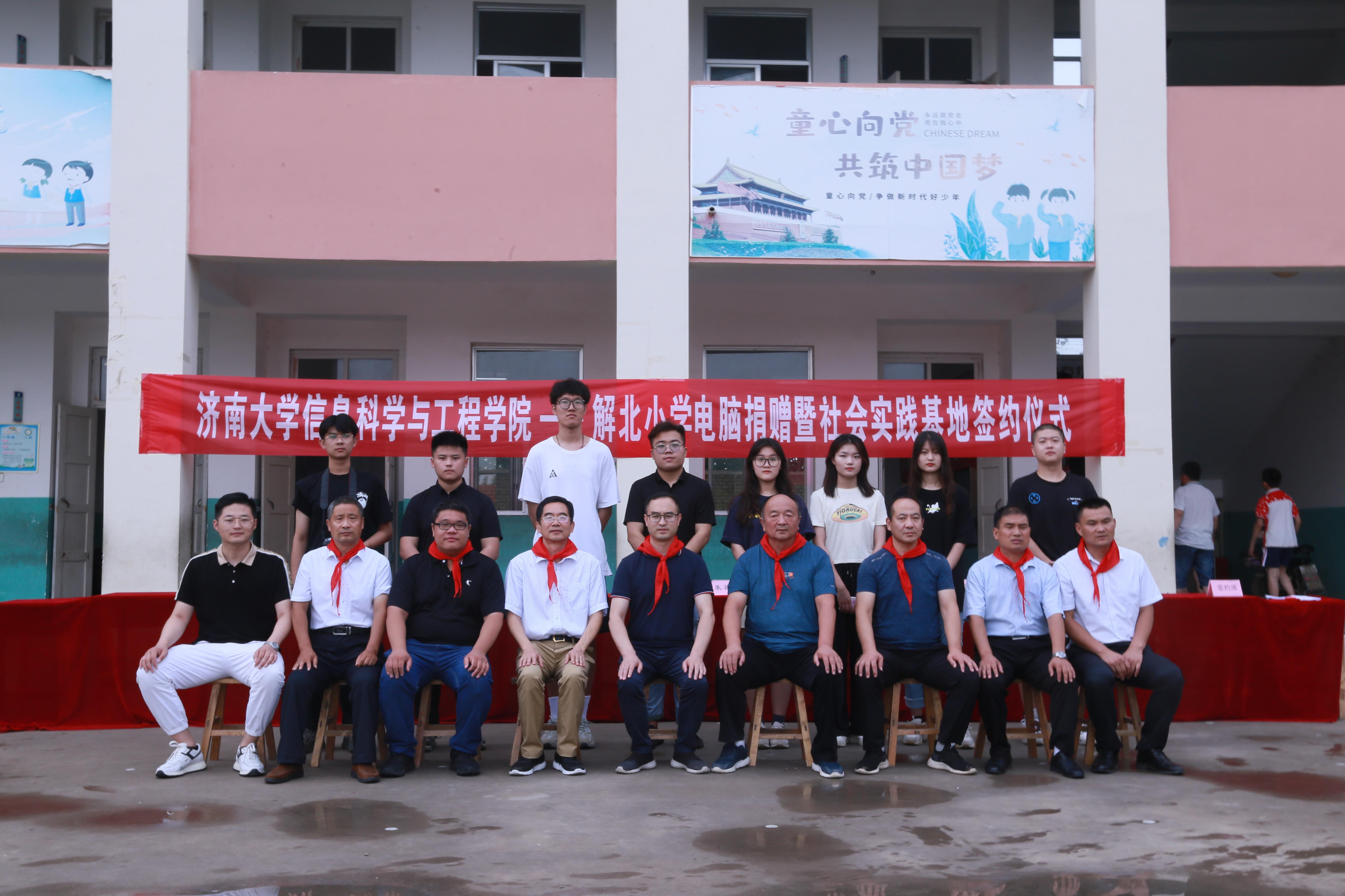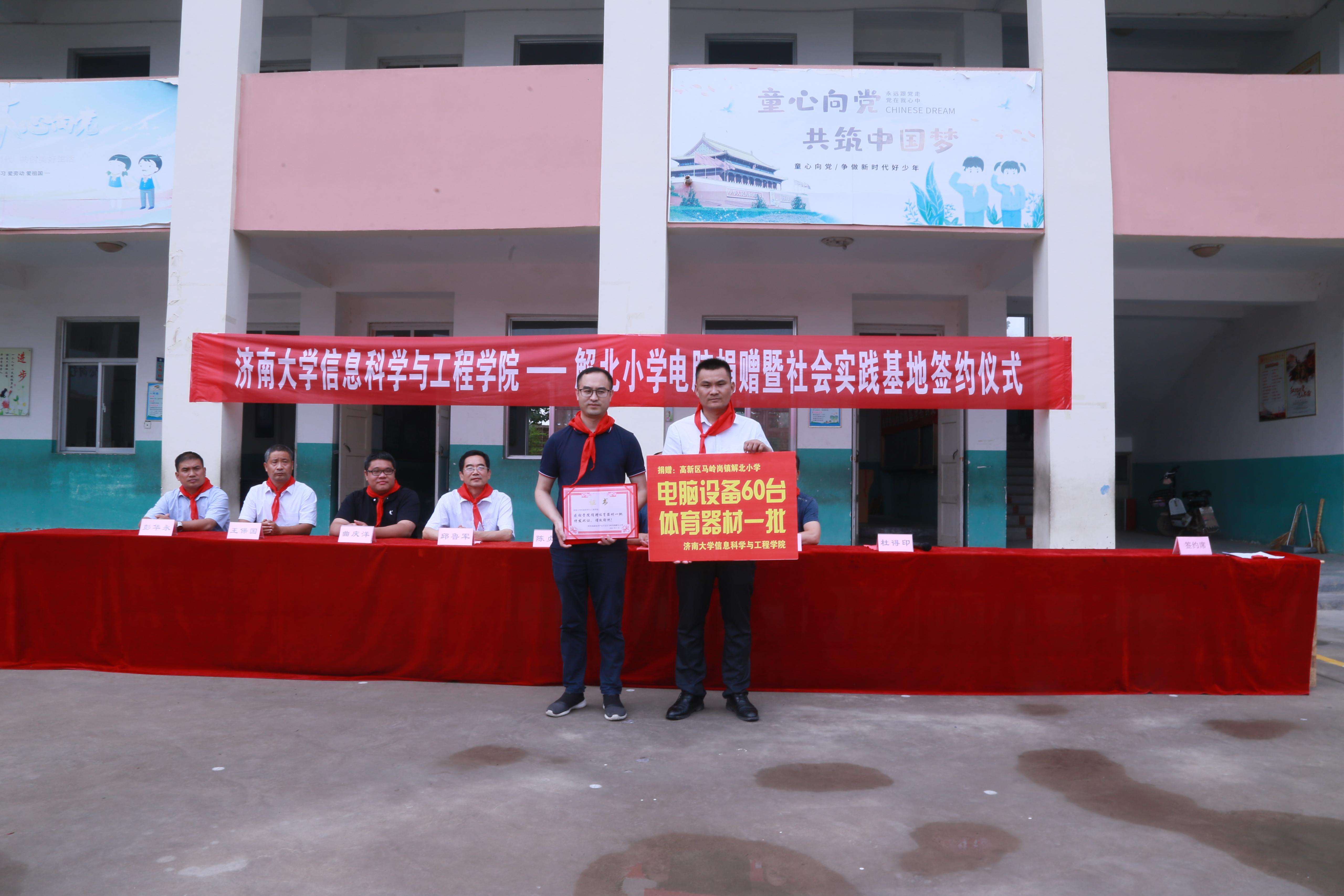 随后,陈贞翔院长与解北小学校长杜得印进行电脑捐赠交接仪式;邱鲁军书记与解北行政村党支部书记常海刚共同为社会实践基地揭牌。