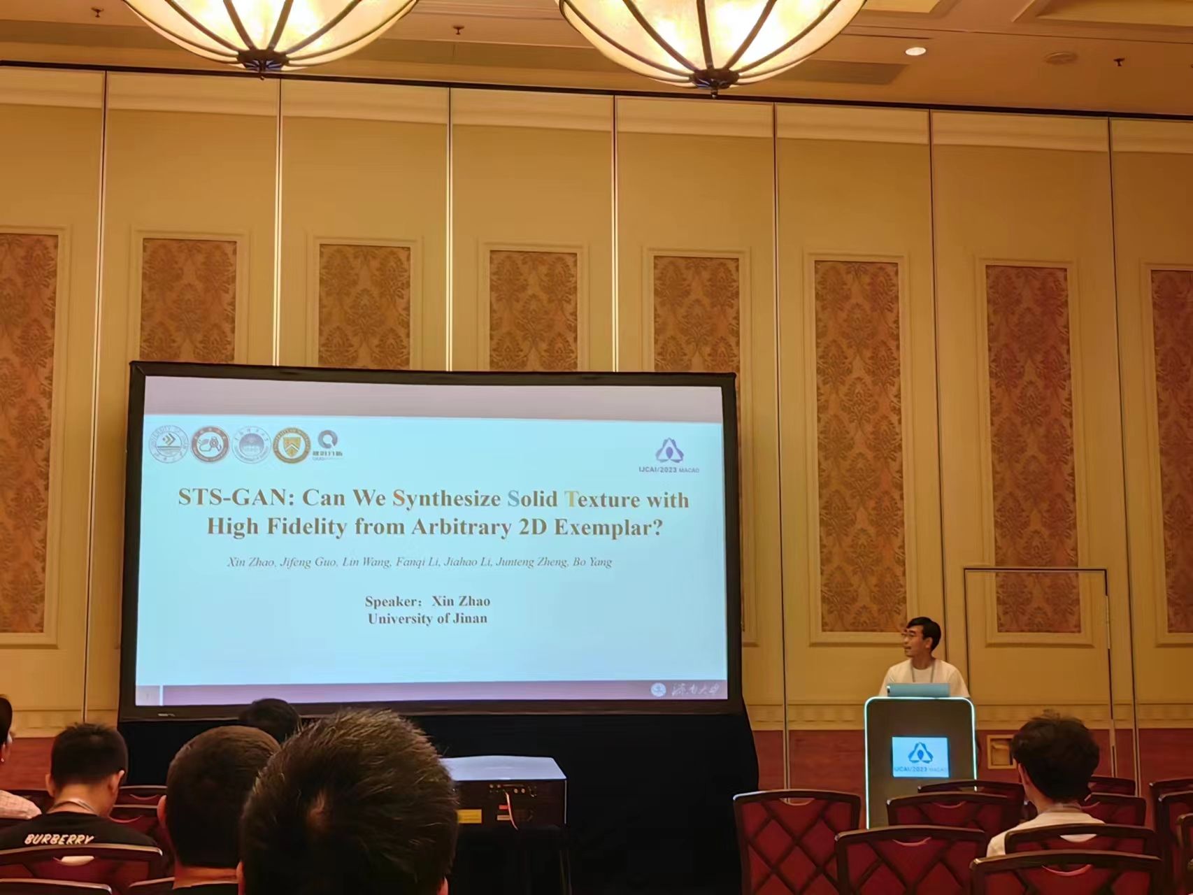 本届会议于2023年8月19日至8月25日在中国澳门举行,汇聚了全球顶尖的人工智能学者。赵欣赴澳门参加大会,在会议期间就该研究成果向国际专家学者做口头学术报告并进行深入探讨。为解决水泥实体微观结构的三维合成问题,论文提出了一种全新的基于生成对抗网络的实体纹理合成技术,通过对抗学习、多尺度学习及全卷积结构等策略,可从任意的二维纹理生成高保真度的实体纹理。该方法包含实体纹理生成器和切片纹理判别器,利用两者之间的对抗学习,将二维纹理扩展到实体纹理。生成器负责生成“逼真的”实体,该实体的各个切面与给定的二维纹理是相似的。同时,作为生成器的竞争对手,判别器的目标是将真实的二维纹理与生成的实体的切面纹理在不同尺度下区别开来。最终,在对抗学习下,生成器可以生成与给定的纹理相似的实体纹理。实验证明,该方法优于其他实体纹理合成方法。