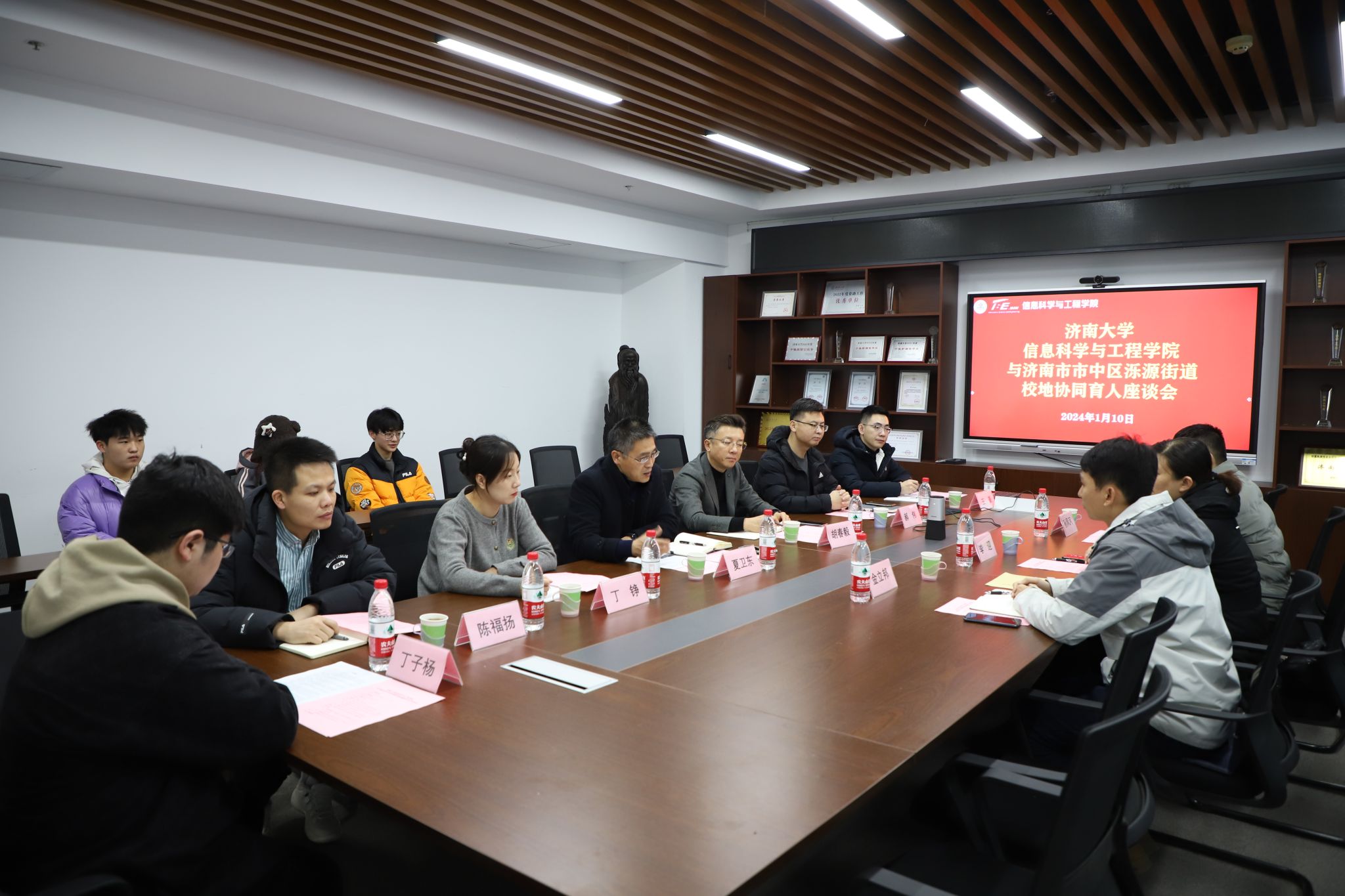 1月10日上午,泺源街道党工委副书记、政协委员联络室主任、总工会主席李迎带队来到学院,送上志愿服务感谢信,对学院在街道和社区党建引领和社区治理等工作中给予的大力支持表示深深的谢意。学校团委书记胡春毅,学院党委书记夏卫东,党委副书记、副院长郝伟出席校地协同育人座谈会并接收感谢信,街道和学院相关负责人员参加会议。座谈会由郝伟主持。
