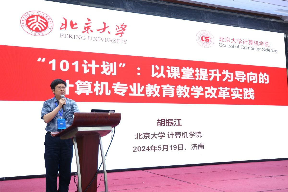 教育部“101计划”计算机学科工作组组长、北京大学计算机学院院长胡振江教授作了题为“‘101计划’:以课堂提升为导向的计算机专业教学改革实践”的特邀报告。报告中,胡振江介绍了“101计划”的总体思路和目标,阐述了项目实施的教研机制,他强调了计算机专业教学改革的重要性,提出了以科学顶层设计推进有组织人才培养改革、以小切口要素改革牵引培养模式深层变革、以数字教育赋能多元化教研机制等思路,并对“101计划”未来建设进行了规划和展望。
