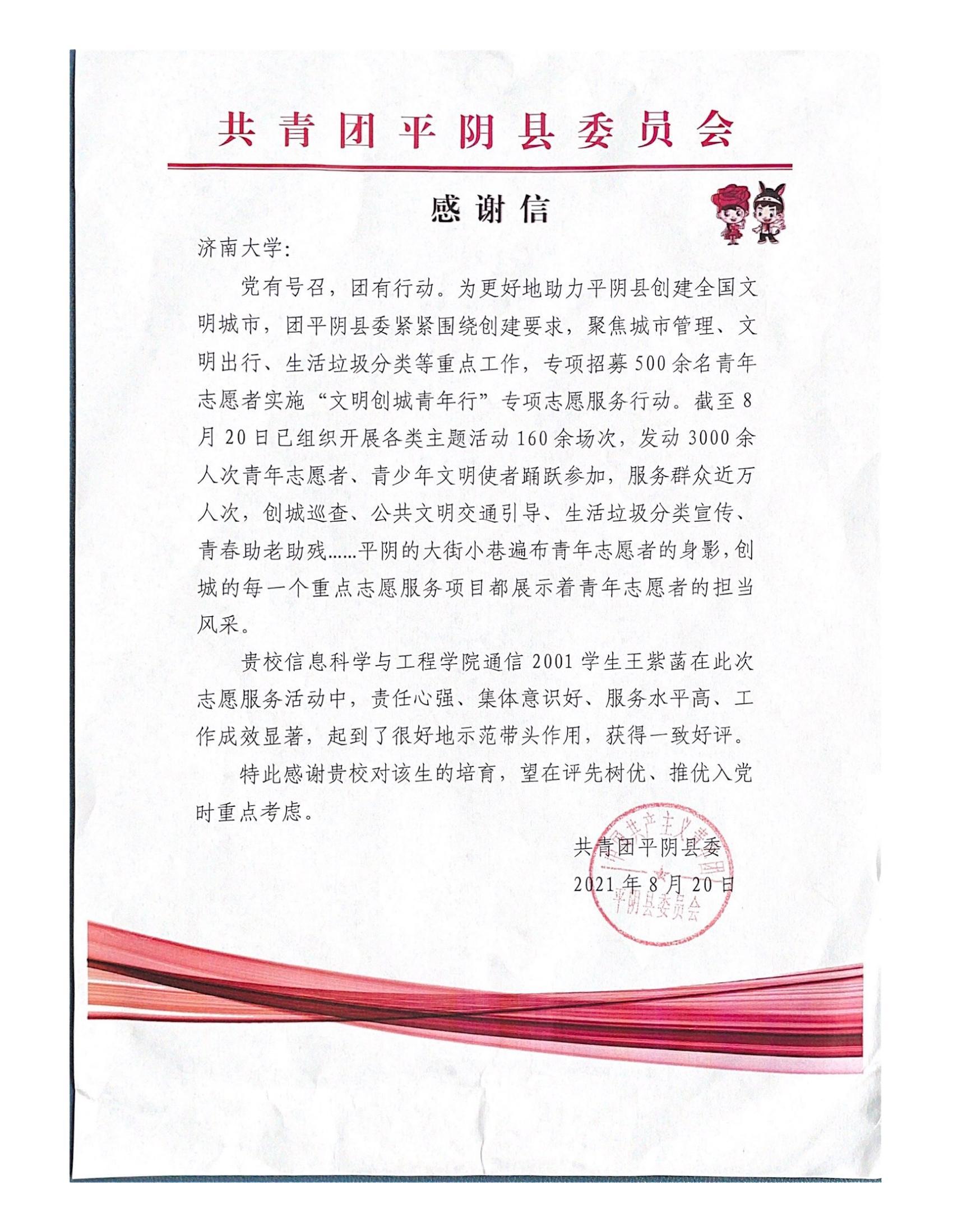收到来自共青团平阴县委员会和中共栖霞市翠屏街道工作委员会的感谢信,感谢色戒