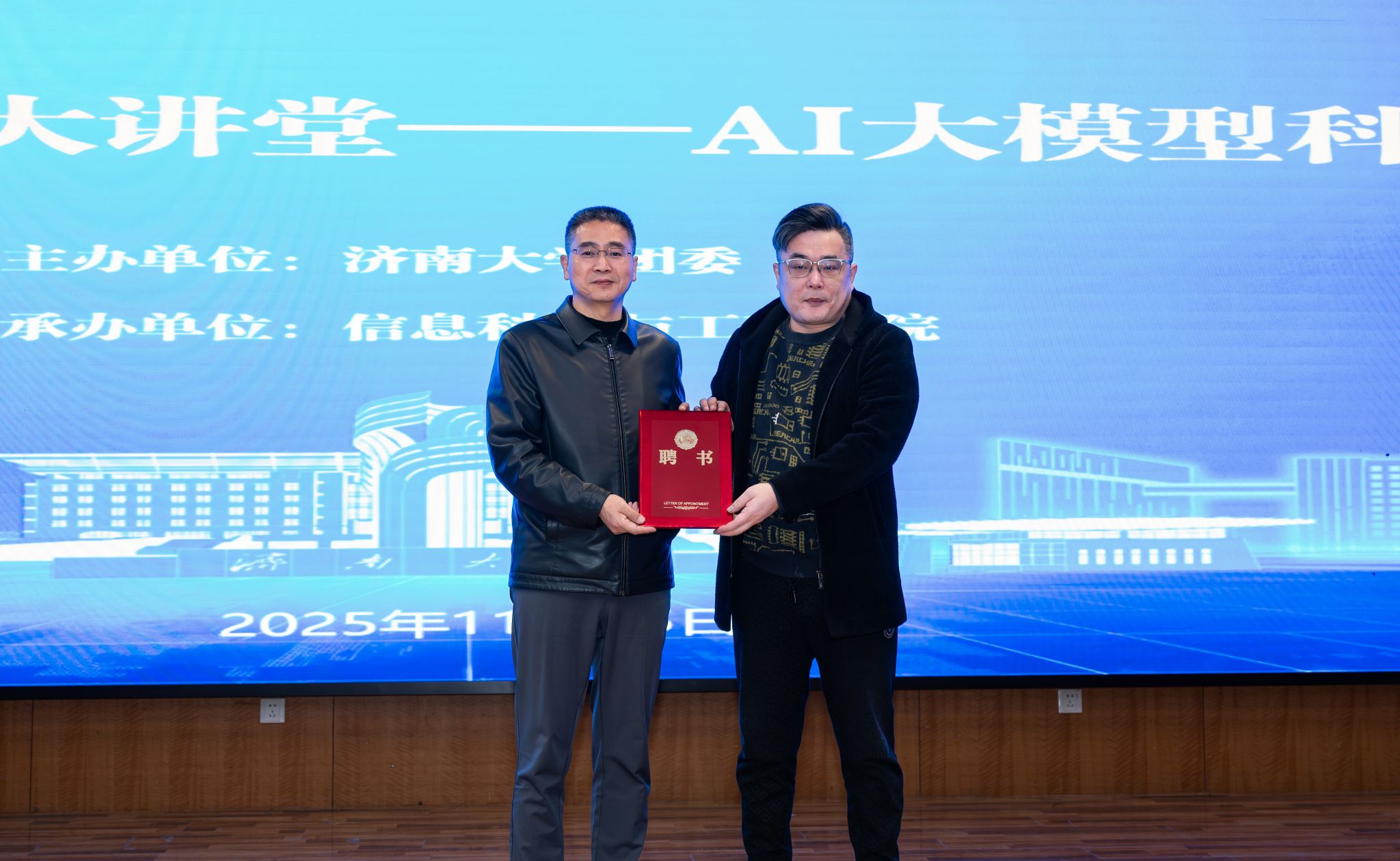 李书翔对王海宁及在场师生的到来表示欢迎,并简单介绍了学校团委“泉城大讲堂”活动情况。他指出,人工智能技术正以前所未有的力量重塑世界格局,驱动产业变革,展现出广阔的发展前景和巨大的赋能潜力。他希望同学们以本次讲座为契机,一要心怀“国之大者”,将个人兴趣与国家战略紧密结合,树立科技报国志向;二要勇于探本溯源,构建跨学科知识体系,增强面向未来的核心竞争力;三要勤于知行合一,积极参与创新创业实践,将知识转化为解决问题的能力,为科技强国建设贡献青春力量。