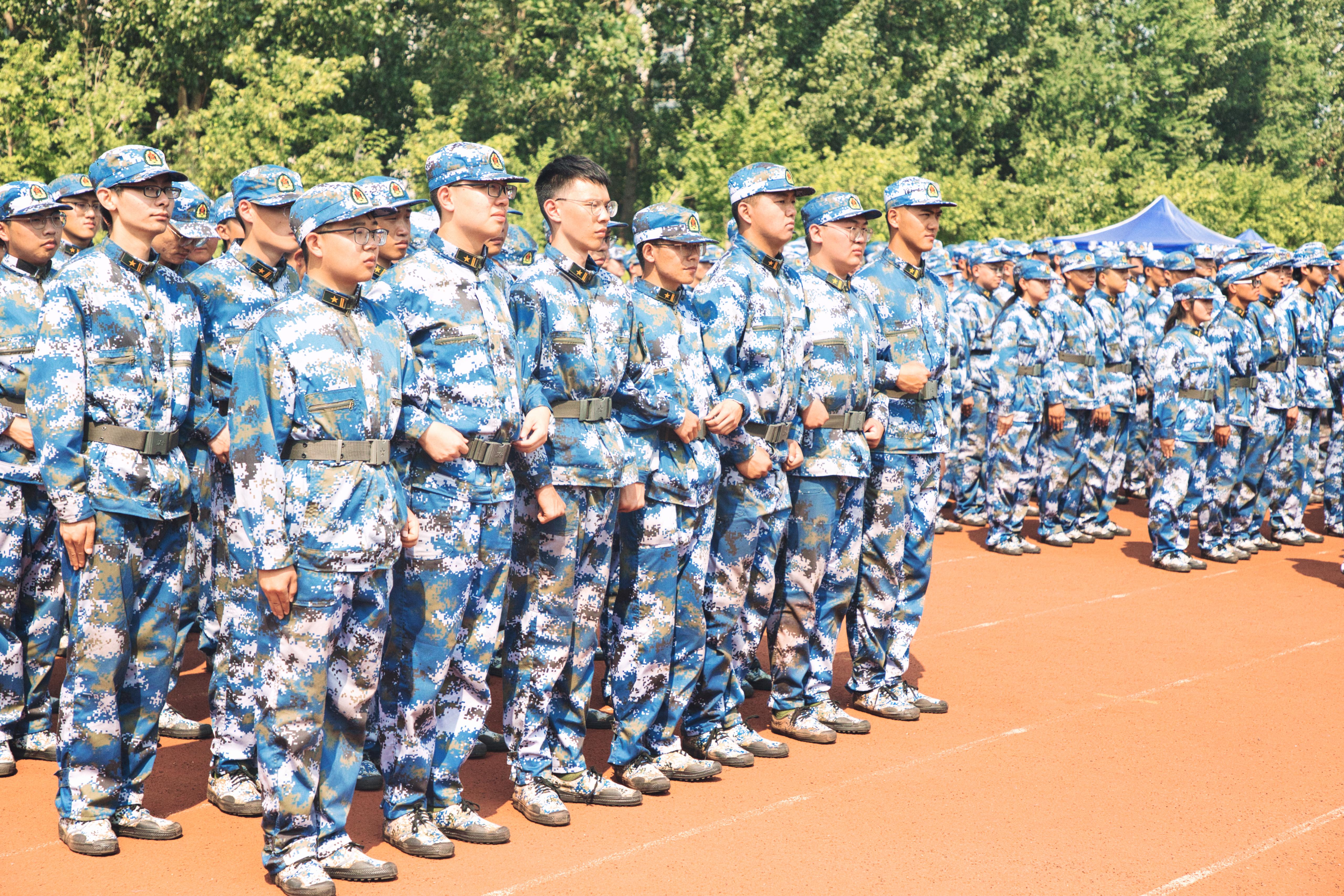 “军训是大学生入学必将经历的过程,除了学术上的思考和积累,坚定的心智和耐力也是一位合格的大学生所必须拥有的。”每一次坚持,每一次调整,都是同学们对自己的挑战,坚毅的脸庞,顽强的身姿,笔挺的军装,在红色的跑道上,组成了一幅和谐而完美的画面。欲与烈日试比强,太阳晒黑了我们的皮肤,却铸就了我们的坚强。