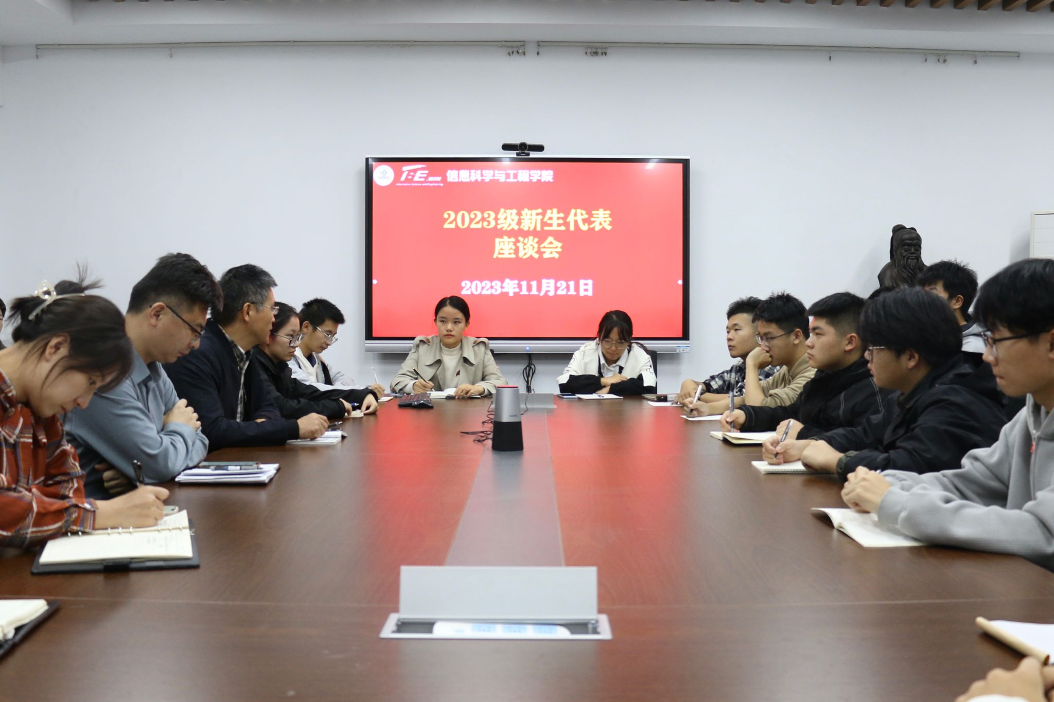 在12教704召开2023级新生代表座谈会。学院党政领导班子成员、全体学生工作人员与2023级新生代表亲切交流座谈,畅谈大学生活,共话人生理想。座谈会由学院党委副书记、副院长郝伟主持。