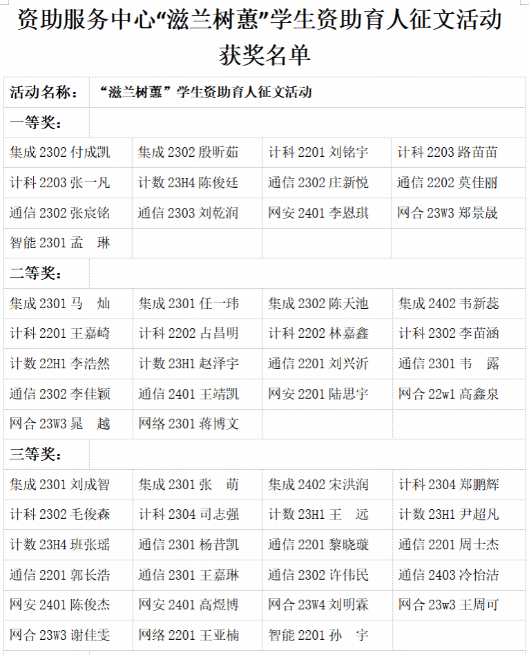 活动期间,学生们结合自身经历,从不同角度展现了资助政策对他们学业和生活的重大影响。有的学生讲述了家庭经济困难曾使自己面临辍学困境,是国家助学金和学院的资助让他们重拾希望,得以在知识的海洋继续遨游;有的学生则分享了在获得资助后,如何从自卑怯懦变得自信勇敢,积极参与社会实践与志愿服务,努力实现自我价值的转变过程。这些征文情真意切,字里行间洋溢着对资助政策的感恩之情,以及在困境中坚守梦想、砥砺前行的决心。下面是本次征文活动的获奖名单: