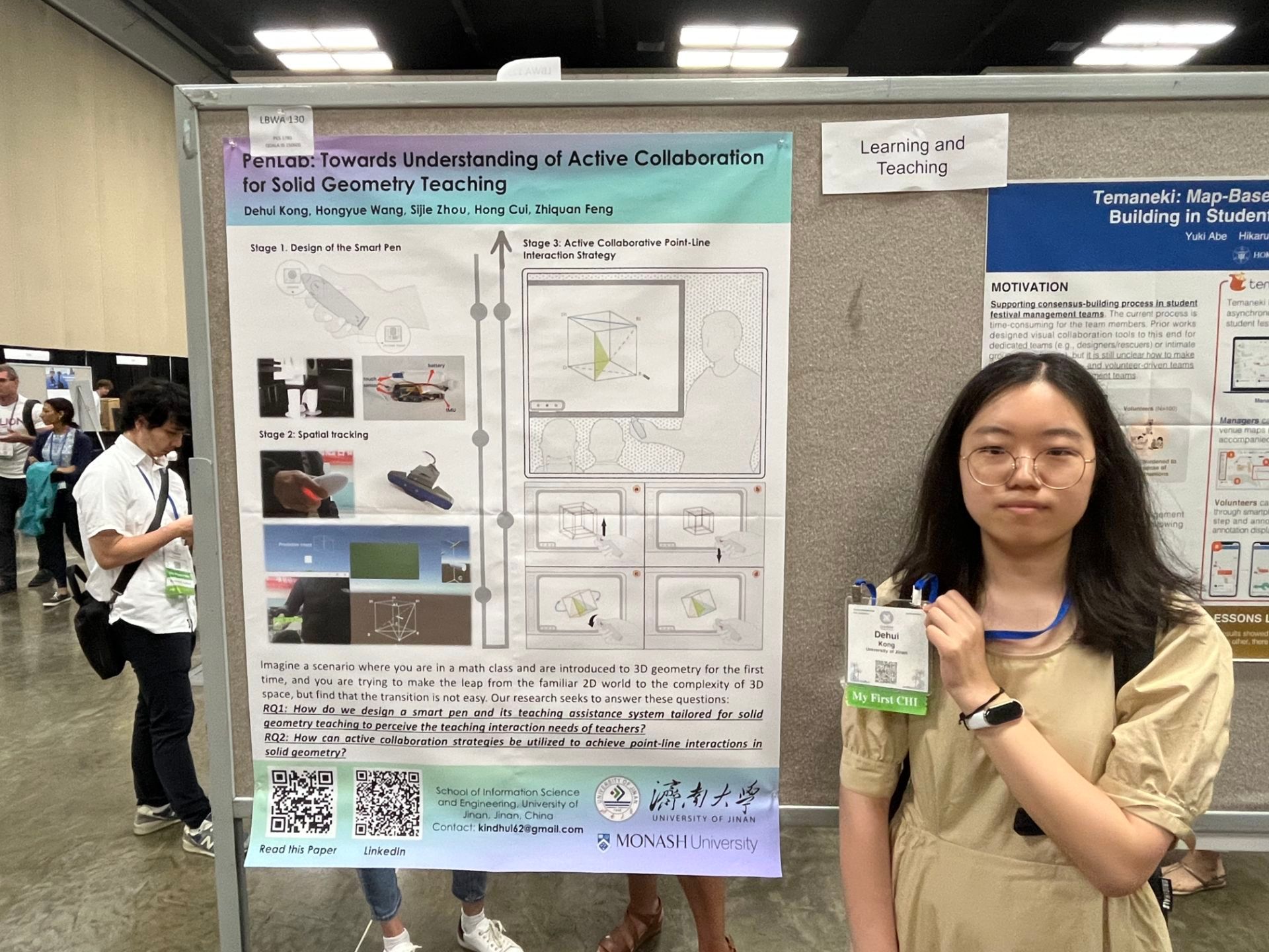 本届会议于2024年5月11日至5月16日在美国檀香山举行,汇聚了全球顶尖的人机交互学者。研究生孔德慧赴美国参加会议,在会议期间就该研究成果做海报展示并与国际专家学者进行深入探讨。随着VR和传感器等技术的不断进步,笔式交互已经超越了二维界面的限制。尽管对于Human-Pen Interaction中握笔姿势、笔势操作和触觉支持等方面的研究已经很深入,但对于笔的主动协同交互的深入探讨仍相对有限。智能笔中的主动协同指的是系统理解老师的交互意图并主动提供反馈和引导协同。面对教师在立体几何教学中笔交互的选不准选不上的困境,论文设计了一种面向立体几何教学的智能笔系统PenLab,由深度摄像头,多传感器嵌入的智能笔和虚拟几何教学平台组成。论文通过邀请参与者体验智能笔系统PenLab,收集了有关参与者体验和态度的定量数据,结果表明,该系统能够以更精准、灵活的交互方式辅助几何教学。