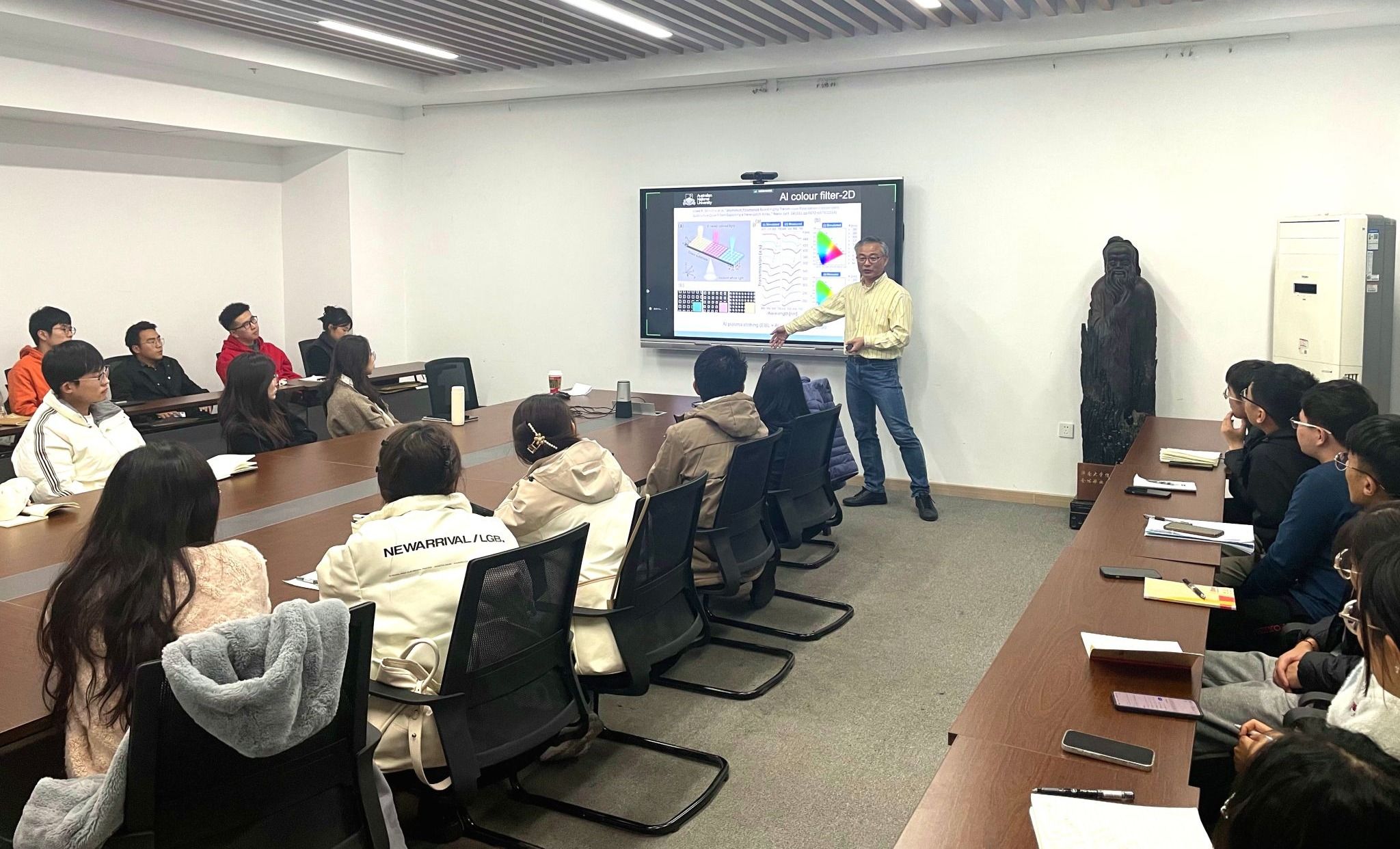 Choi教授在报告中首先详细讲解了他所熟练掌握的基于电子束光刻和原子层沉积工艺技术面向金属、半导体、介电材料在不同纳米尺度下的人工微结构制备流程,细致介绍了其中有关少层和双面纳米结构精准制备的关键技术难点,并展示了由他亲自加工制备的多种高加工精度纳米结构。基于这些纳米结构所构筑的超构器件,他与合作者开展了面向不同领域的应用探索,包括红外传感、溶液识别、信息加密、激光雷达、片上波导、量子芯片、光镊微粒操纵、结构色显示等前沿热点,超构器件多元化的应用场景引起了参会老师和同学们的极大兴趣。报告后,Choi教授认真回答了与会师生提出的问题,并就超构技术的未来发展动向以及超构器件的产业化等热点问题与在场师生进行了细致交流,并参观了集成电路制造实验室。