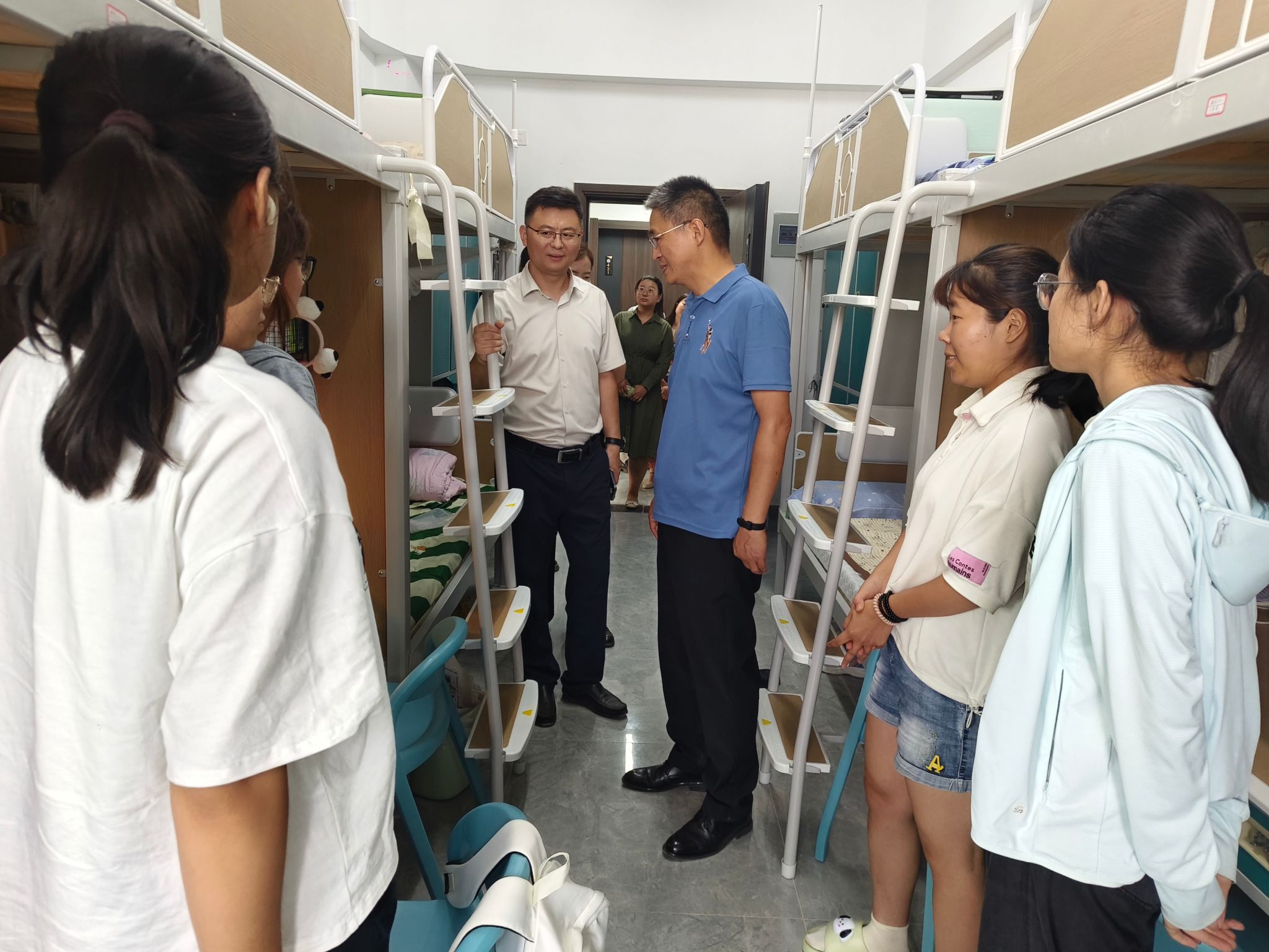 家长见面会后,学院领导与辅导员、班主任组成慰问小组,逐一走访了新生宿舍,为初入校园的同学们送上关怀与指引。走进宿舍,老师们首先亲切地与同学们及陪同家长打招呼,仔细查看了宿舍的床铺整理、物品摆放情况,询问大家是否顺利完成入住、生活必需品是否齐全、对住宿环境是否适应。在与新生的交谈中,老师们耐心倾听大家的到校感受,鼓励同学们尽快调整状态,快速融入集体生活,并主动分享了适应大学学习节奏、参与校园活动的经验建议。
